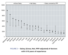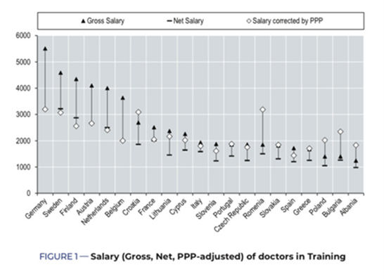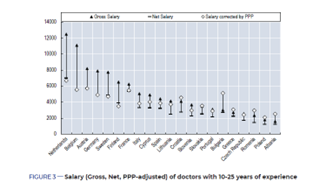 Nell’analisi i compensi dei medici del settore pubblico, espressi come importi lordi, netti e a parità di potere di acquisto (PPP), sono stati ordinati per livelli di esperienza e fascia di anzianità di servizio: medici in formazione, specialisti con esperienza di 0-10 anni, di 10-25 anni e oltre 25 anni, o medici senior.