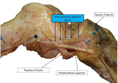 Il ALL viene considerato come un legamento distinto, con una inserzione femorale posteriore e prossimale all’epicondilo laterale e un’inserzione tibiale situata tra il tubercolo di Gerdy e la testa del perone. Studi biomeccanici hanno evidenziato che la ricostruzione del complesso antero-laterale determina una significativa riduzione nella traslazione anteriore e della rotazione interna tibiale in un ginocchio senza LCA [10].