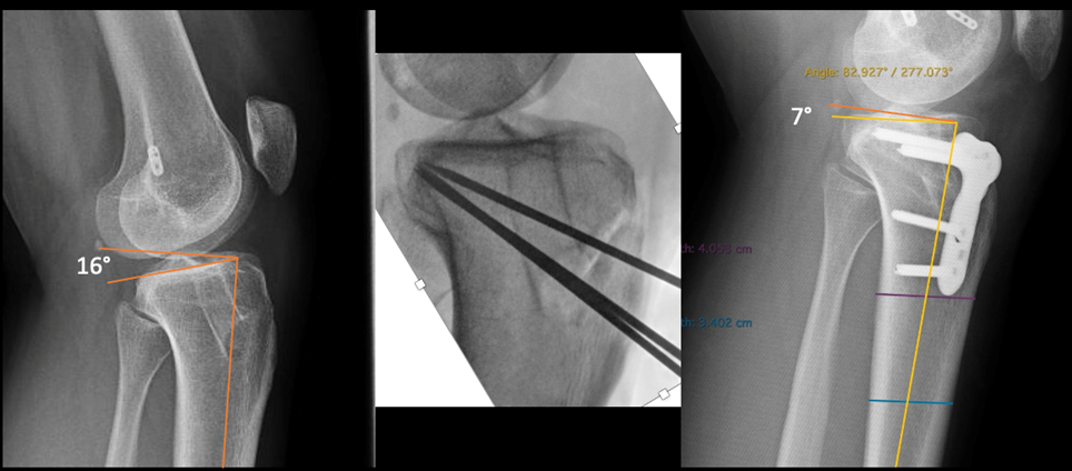A) Caso di aumentato slope tibiale in esiti di pregressa ricostruzione del legamento crociato anteriore; B) Posizionamento dei fili guidi per l’ostetomia di riduzione dello slope; C) Risultato post-operatorio dopo osteosintesi con placca dedicata
