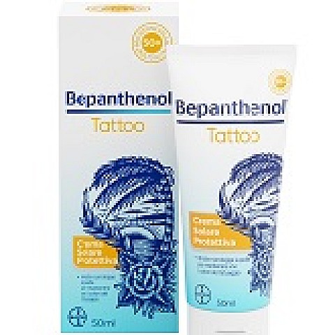 Bepanthenol Tattoo Crema Solare Protettiva SPF 50+ di Bayer è l'alleato per la protezione della pelle tatuata dai raggi del sole. Idrata e protegge la pelle per mantenere vivi i colori del tatuaggio e grazie all'ampio spettro di protezione dai raggi UVA e UVB ne preserva la bellezza. Contiene pantenolo, noto per supportare il naturale processo di rigenerazione della pelle, - filtri solari fisici e chimici.