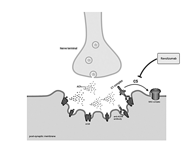 Nella MG, l’attivazione del complemento da parte degli autoanticorpi, porta al clivaggio di C5 in C5a e C5b e quindi all’attivazione delle frazioni a valle della cascata che culmina nella formazione del complesso di attacco alla membrana cellulare (MAC) cioè della formazione di pori litici nella membrana post-sinaptica della giunzione neuromuscolare (NMJ), con rottura delle pliche postsinaptiche, perdita e dispersione degli AChR.